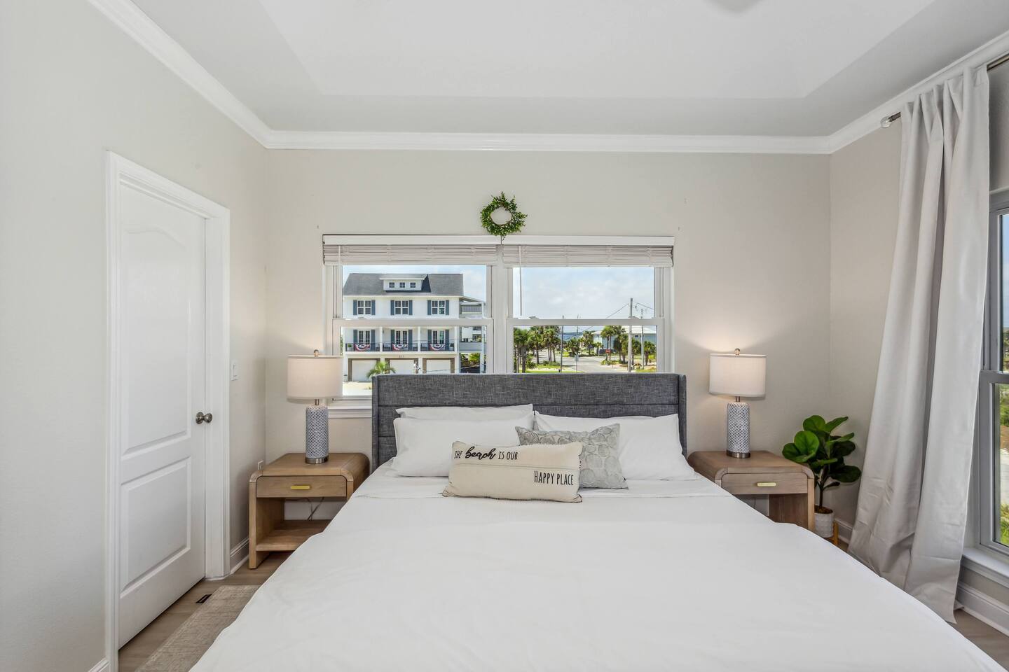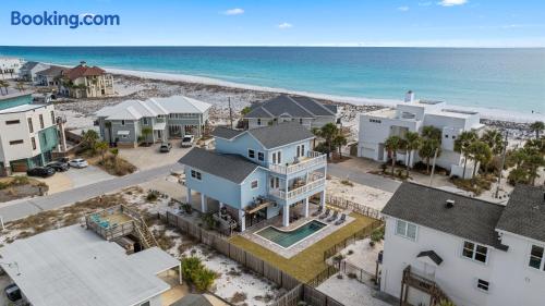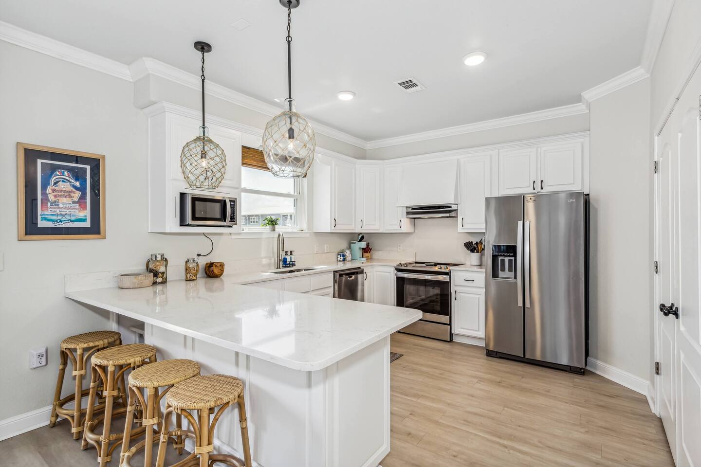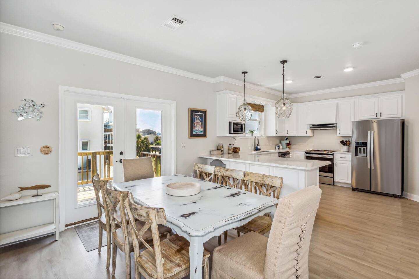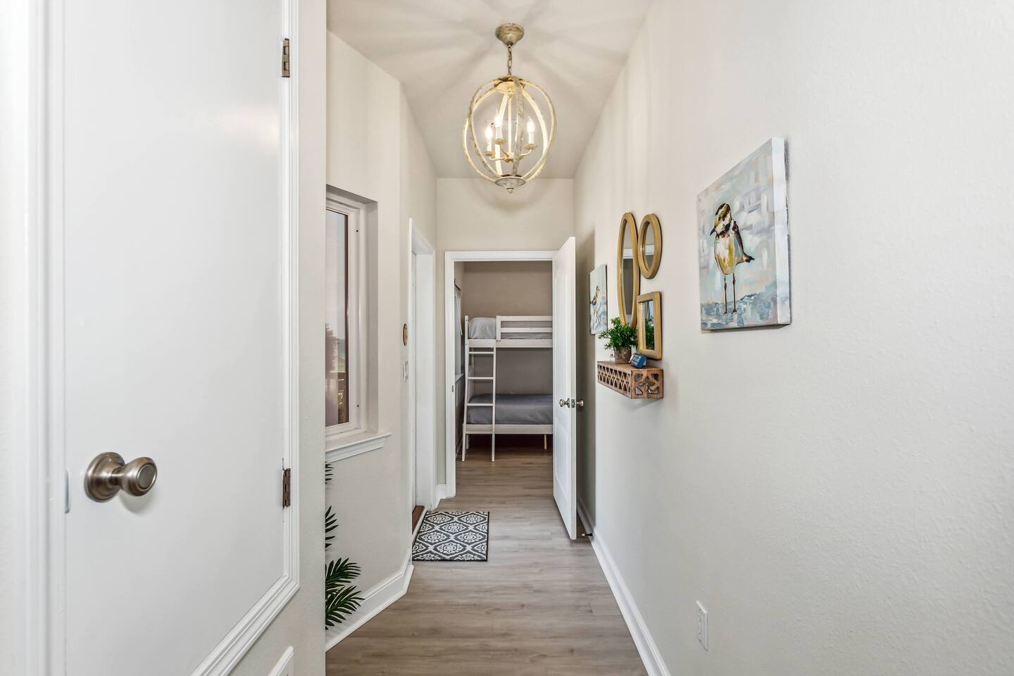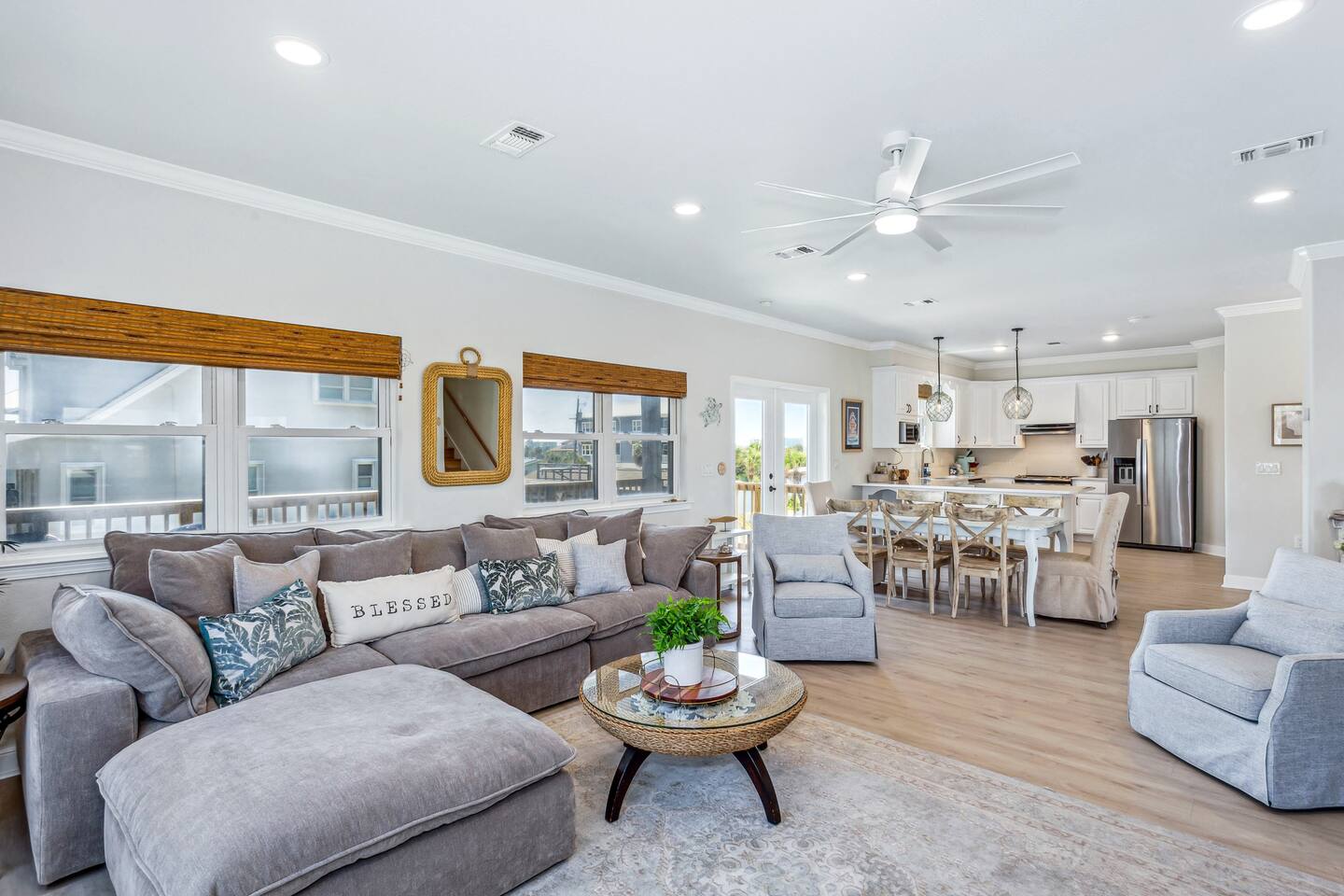 Welcome to Blue Horizon, your dream beach getaway just 20 steps from the white sands of Pensacola Beach! With beautiful gulf views from nearly every room and your own private pool, this is the perfect location for your next trip. Our home is designed to feel inviting for all our guests, even those with tiny toes or four legs. When you step inside, you're greeted by a bright, spacious, and open living space, dining area, and modern kitchen, all flooded with natural light. Look out the windows to see the turquoise Gulf waters just across the street! The main living area boasts comfortable seating and a Smart TV with streaming apps, including our logins for Disney+ and Hulu. The dining table seats eight, with additional seating at the kitchen bar counter. The kitchen is fully stocked with appliances, a spice drawer, and the basics you need to prepare your meals. We also provide a starter supply of coffee and creamer. Down the hall, you'll find a full bathroom and a full-size washer and dryer. This area is also stocked with a blow dryer, steamer, iron, ironing board, and beach towels. The main floor also includes a large bedroom with a fabulous King bed, a Smart TV, and another beautiful water view from its floor-length window. This level features two large decks, one on each end of the home, both offering stunning gulf views. Heading upstairs, you'll find two more bedrooms. One features an inviting King bed, a Smart TV, and French doors leading to a deck where you can catch a beautiful sunset over the Sound or gaze at the Gulf. The second bedroom offers more Gulf views and contains two twin-over-full bunk beds. Both rooms share access to the deck and a bathroom with a walk-in shower. An additional large deck with sun loungers is the perfect spot to soak in the sun as you listen to the waves. Sleeping Arrangements: Bedroom #1 - King bed Bedroom #2 - King bed Bedroom #3 - Two full over twin bunk beds Your Private Outdoor Oasis: The ground level is your hub for outdoor fun! Take a dip in the newly built heated private pool, enjoy a meal at the picnic table, or play a game of cornhole. You'll also find an outdoor rinse-off shower and a grill. Family-Friendly Amenities: - Two Pack 'n Plays with sheets - Portable high chairs and foldable beach/high chairs - Sound machine and a non-WiFi baby monitor - Baby/toddler utensils, cups, and plates - Infant-to-toddler bath and removable wand shower head - Extra blackout curtains, bed bumpers, a baby gate, and outlet covers Beach Gear Provided: - 8 backpack beach chairs - 10 beach towels - Neso beach shade tent and a beach blanket - 3 boogie boards and 1 SUP paddleboard - Beach cart, cooler, sand toys, and sports balls The Neighborhood Our home is perfectly located in a friendly, quiet neighborhood ideal for walking and biking. We're, just a quick walk from numerous cafes, restaurants, and shops. We're are a handful of steps from the sugar-white sand, with public beach access directly across from our yard. We're also just a short walk or bike ride from the Sound, Baby Beach, and numerous cafes, restaurants, and shops along Via De Luna. We have full-time neighbors, so it's important that our guests respect the peaceful atmosphere. Getting Around With direct beach access and shops nearby, the area is very walkable. The local trolley stops are also close and can take you up and down the main strip. For exploring further, the driveway comfortably fits 3 large vehicles. House Rules - To ensure a wonderful stay for you and our neighbors, we ask that you please observe the following rules: - No smoking is permitted anywhere on the property. A fee for cleaning and odor removal will be charged. - No parties or events are permitted. - Overnight guests must not exceed the number listed on the reservation. - Please respect our neighbors and abide by the 10:00 p.m. noise curfew. Noise violations may be grounds for eviction. - We happily welcome well-behaved dogs for a flat fee (per dog; 2 max dogs max). You are responsible for any damage or additional cleaning fees. - Please treat our home and amenities as if they were your own. Important Information - Connectivity: High-speed WiFi is available throughout the home. - Pool Heating: The private pool can be heated upon request for an additional daily fee. Please let us know at the time of booking if you'd like to add this. - Bunk Beds: For safety, the upper bunk beds have a maximum weight limit of 175 pounds. - Grill: Charcoal & gas grills are available for your use. We do not provide charcoal or propane, but previous guests often leave their leftovers. - Check-in/Out: Check-in is 4:00 p.m. and check-out is 10:00 a.m. We may be able to accommodate an early check-in or late check-out if our cleaning schedule allows. - Starter Supplies: We provide starter amounts of laundry detergent, dishwasher tabs, toilet paper, paper towels, trash bags, and coffee to get you settled in. - Ample parking available for 3-4 cars - Smoke alarms, CO2 sensors, and fire extinguishers available - Your Host: I am self-managed, highly responsive host committed to making your stay exceptional. If any issues arise, please don't hesitate to reach out.