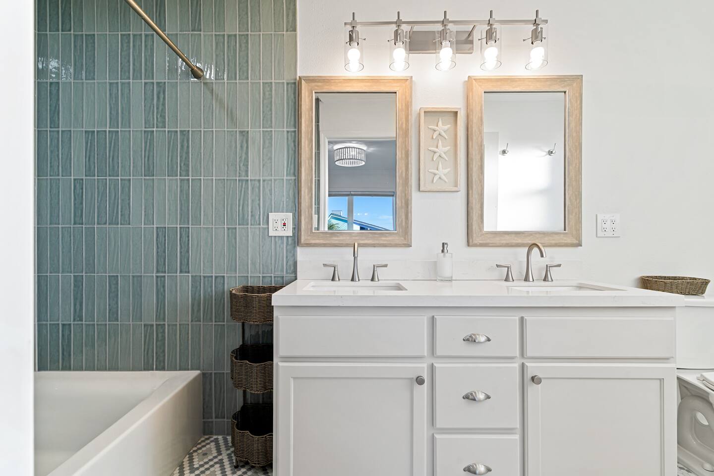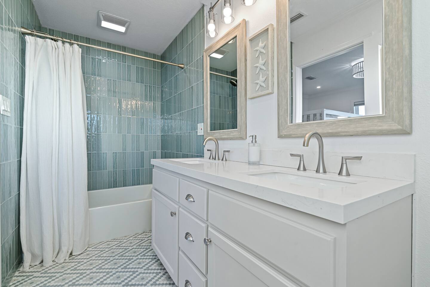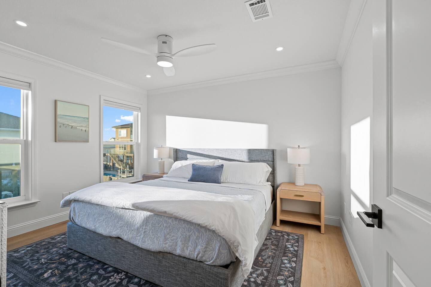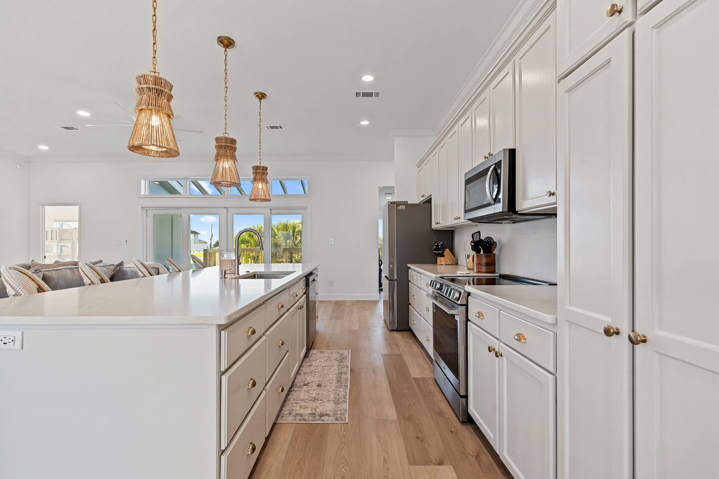 Step inside our bright and welcoming home, where an open and spacious living area, dining room, and kitchen greet you. Large glass doors frame views of the Gulf waters just across the street, filling the space with natural light. The living area features comfortable seating and a Smart TV, with a cozy nook perfect for relaxing with a book while taking in the view. The fully stocked kitchen is a chef's dream, complete with a spice drawer, air fryer, crock pot, Keurig, and traditional coffee maker. We provide a starter supply of coffee, creamer, and sugar to get your vacation started right. The dining table seats 10, with additional seating at the large kitchen island. For entertainment, you'll find a Nintendo Switch and a collection of board games, ensuring fun for all ages on rainy days or quiet evenings in. Sleeping Arrangements: Our home comfortably sleeps your entire group across five thoughtfully appointed bedrooms. - East Wing Bedroom 1: King Bed, Smart TV, Water Views - East Wing Bedroom 2: Two Queen Beds, Water Views - West Wing Bedroom 1: King Bed, Smart TV, Water Views - West Wing Bedroom 2: King Bed, Smart TV - Bunk Room: Two Twin-over-Full Bunk Beds, Smart TV, En-suite Bathroom (Note: Top bunks have a 220 lb weight limit). Your Private Outdoor Oasis: Through the large glass doors at the rear of the home, a deck leads down to your private, fully-fenced backyard. The star of the show is the brand-new 30’ pool, featuring a sun ledge perfect for lounging. The pool area is surrounded by ample seating, sun loungers, and a beautiful lawn for games like corn hole. Enjoy a meal at the picnic tables, cook up a feast on the XXL Green Egg or the plumbed natural gas grill, and gather around the fire pit in the evening. A large outdoor shower is perfect for rinsing off after a day at the beach. Family-Friendly Amenities: - A Pack 'n Play with sheet - Bumbo (functions as high chair) and foldable beach/high chair with tray - Sound machine and a non-WiFi baby monitor - Baby/toddler utensils, cups, and plates - Bathtub and removable wand shower head - Extra blackout curtains, bed bumper, a baby gate, and outlet covers Beach Equipment Provided: - 10 backpack beach chairs & 15 beach towels - Inflatable SUP paddleboards and a tandem kayak - Beach cart, cooler, boogie boards, and sand toys - Shibumi beach shade tent The Neighborhood Sea'scape is perfectly located in a friendly, quiet neighborhood ideal for walking and biking. You are less than a minute from the sugar-white sand, with public beach access diagonally across from our yard. You're also just a short walk or bike ride from the Sound, Baby Beach, and numerous cafes, restaurants, and shops along Via De Luna. Getting Around The area is highly walkable and bike-friendly. For exploring further, trolley stops are located nearby (including one at Avenida 17) and can take you up and down the main strip during peak seasons. House Rules - We happily welcome well-behaved dogs for a flat fee. - For the safety of our guests, the top bunks have a weight limit of 220 pounds. - Please treat our home and amenities as if they were your own. Important Information - Home Layout: Our home is an elevated, single-level living space. The main house, including all bedrooms and living areas, is on one floor. Stairs provide access from the main level down to the ground-level pool, yard, and storage area. - Connectivity: High-speed WiFi is available throughout the home. - Provided Supplies: We provide a starter supply of essentials like coffee, toilet paper, soap, shampoo, and detergent to help you settle in. - Ample parking available for 10-12 cars - Smoke alarms, CO2 sensors, and fire extinguishers available - Your Host: I am self-managed, highly responsive host committed to making your stay exceptional. If any issues arise, please don't hesitate to reach out.